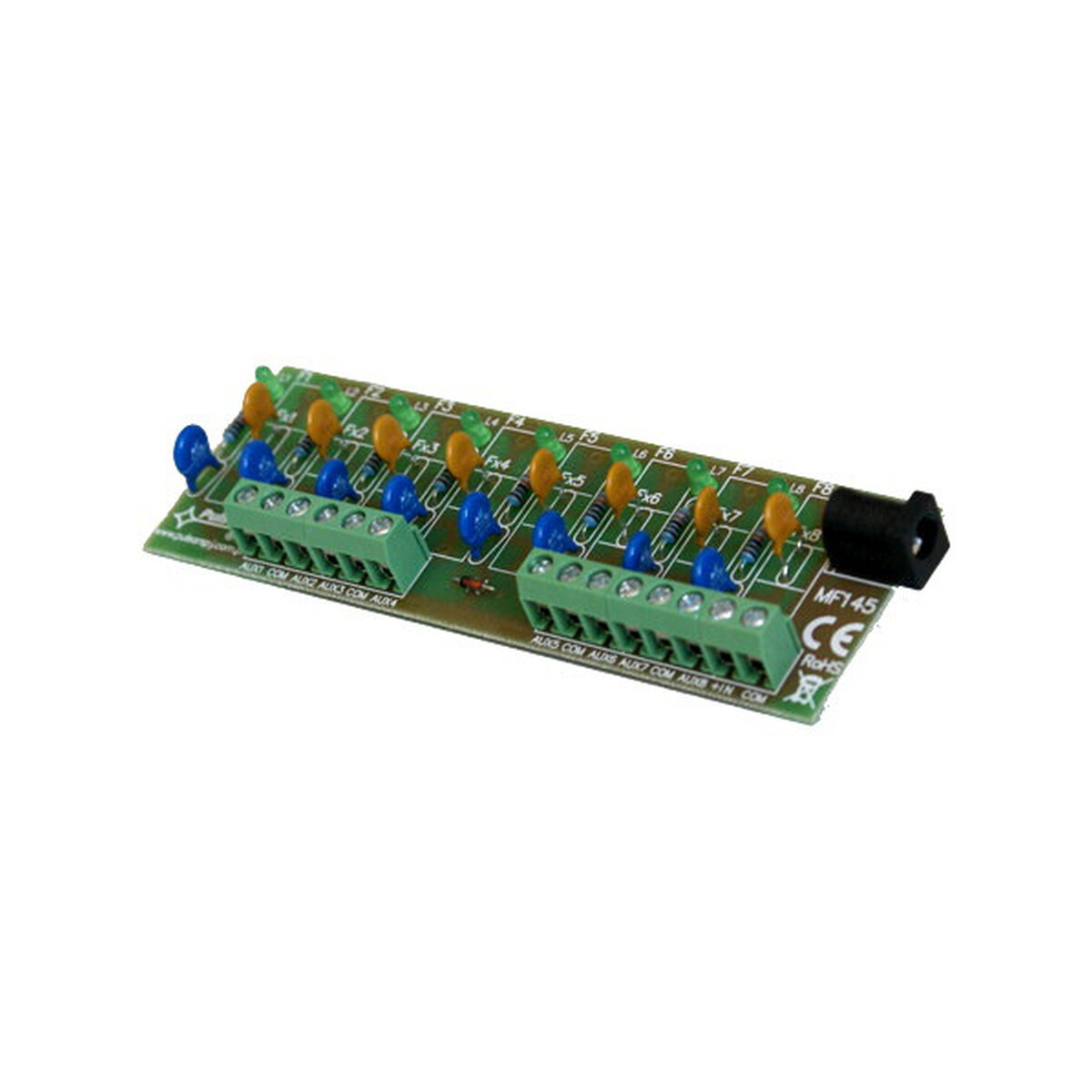 Moduł bezpiecznikowy przeznaczony jest do rozdziału zasilania w systemach alarmowych niskonapięciowych (dystrybucja zasilania). Posiada dwa wejścia zasilania: złącze śrubowe IN oraz gniazdo DC 5,5/2,1. Moduł akceptuje napięcie z zakresu: 10 V÷ 30 V DC. Moduł posiada osiem niezależnie zabezpieczonych wyjść zasilania AUX1÷AUX8. W zależności od wersji, wyjścia AUX1÷AUX8 zabezpieczone są bezpiecznikami topikowymi lub bezpiecznikami polimerowymi. Uszkodzenie bezpiecznika topikowego lub zadziałanie bezpiecznika PTC sygnalizowane jest poprzez zgaszenie odpowiedniej diody LED: L1 dla AUX1 itd. Dodatkowo każde z wyjść listwy zabezpieczone jest warystorem chroniącym zasilacz oraz odbiorniki przed skutkami wystąpienia przepięć w układzie zasilania.