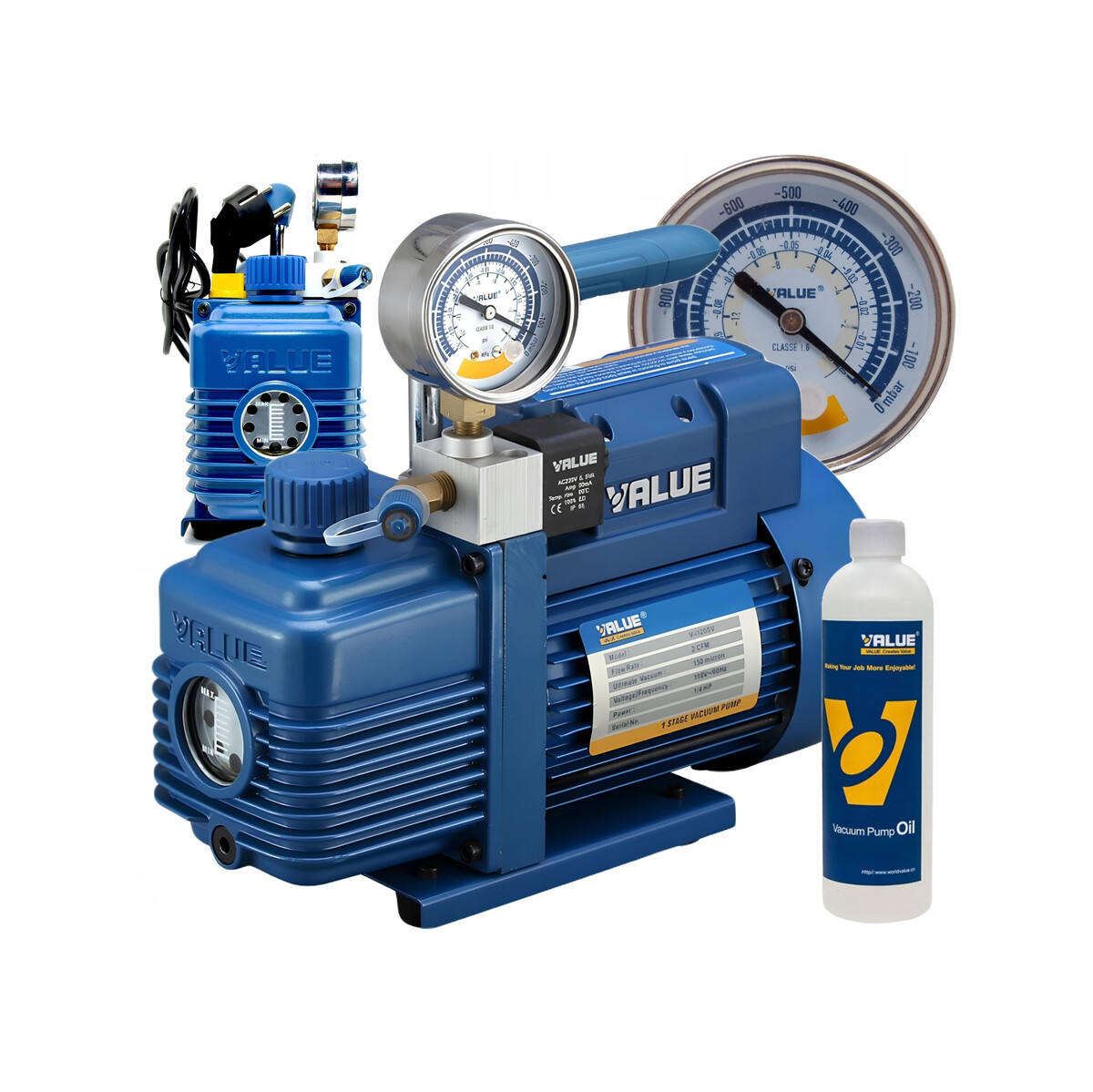Pompa próżniowa jednostopniowa znanej i cenionej marki VALUE przeznaczona do pracy z czynnikami chłodniczymi z grupy HFC i HCFC (np: R410A, R407C).