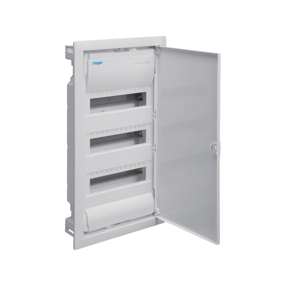 Rozdzielnica instalacyjna podtynkowa Hager Volta przeznaczona jest do montażu aparatury modułowej w instalacjach elektrotechnicznych. Obudowa posiada 3 rzędy z których każdy może pomieścić 12 modułów.
