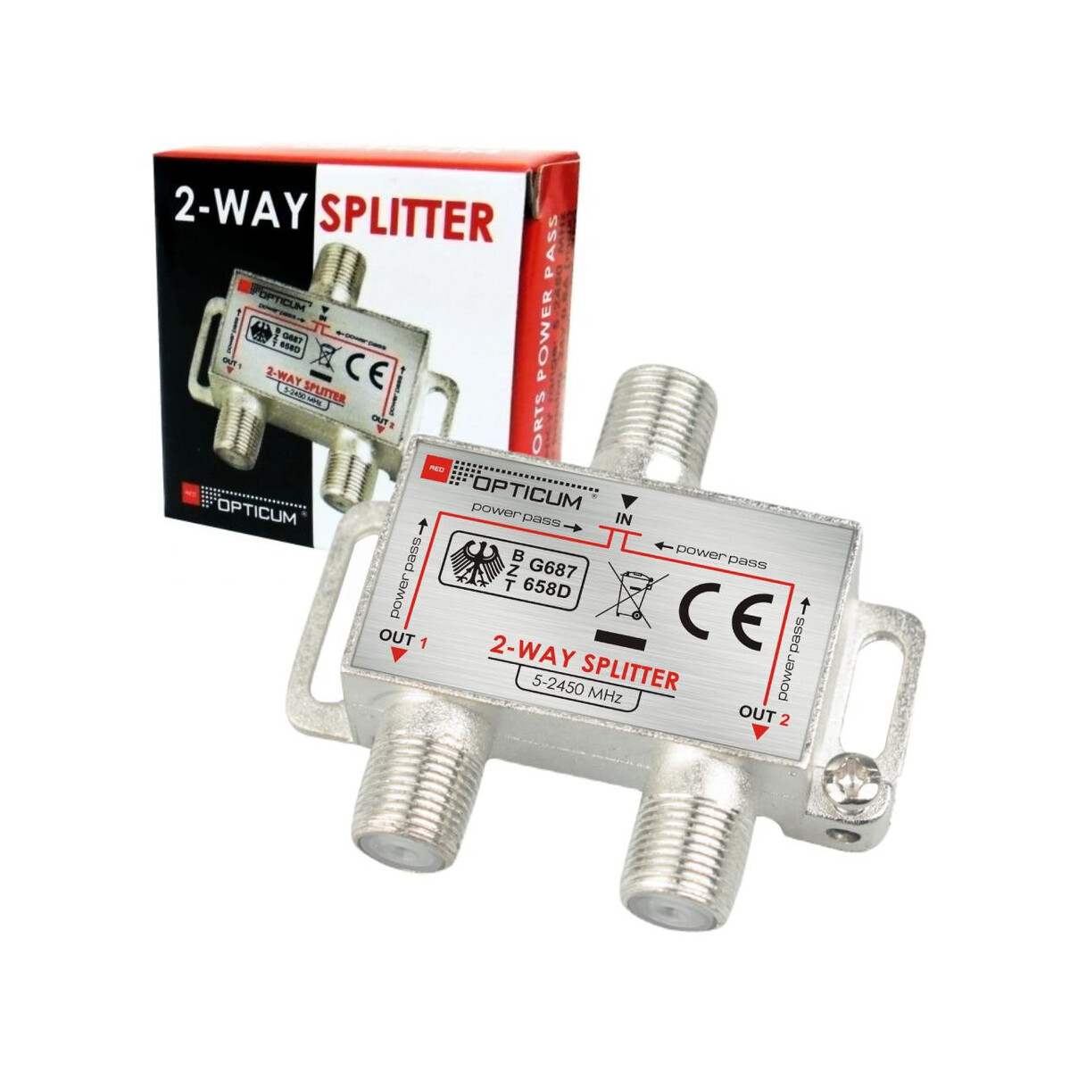 Rozgałęźnik dwukrotny przeznaczony dla DVB-T/T2, DVB-S2, do użytku wewnętrznego.