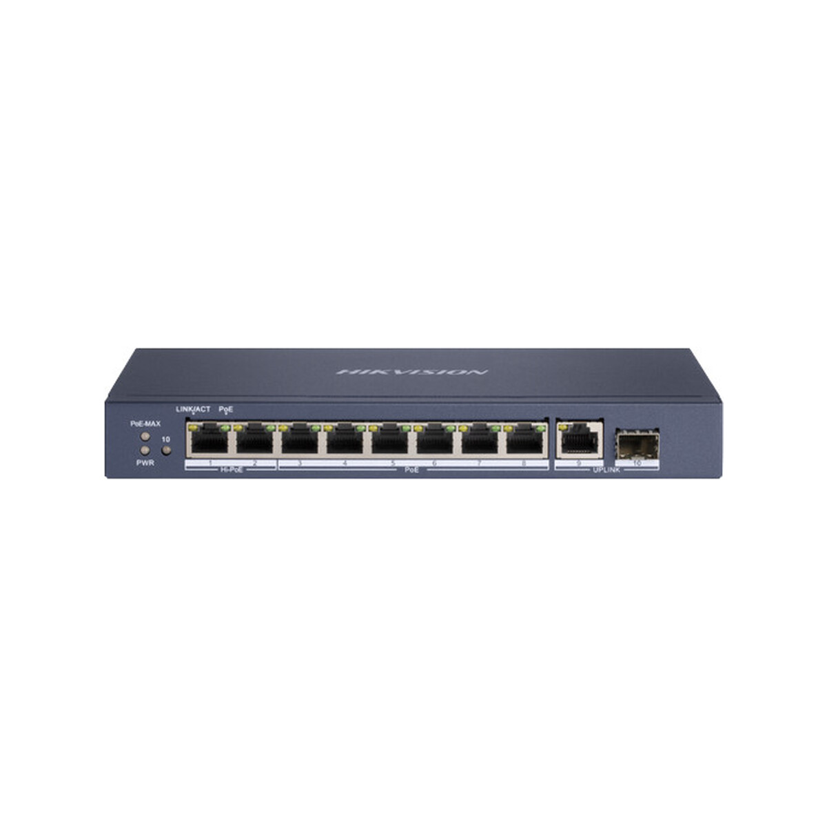 - 6 × gigabitowe porty PoE, 2 × gigabitowe porty Hi-PoE, 1 × gigabitowy port RJ45 i 1 × gigabitowy port światłowodowy.