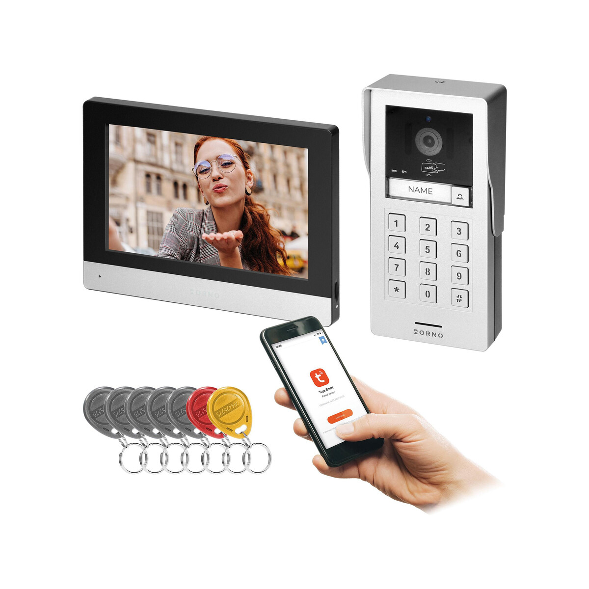 - Szyfrator i czytnik RFID – Zewnętrzny panel wyposażony jest w szyfrator na kod PIN oraz czytnik RFID, który obsługuje breloki i karty zbliżeniowe (5 breloków w zestawie). Dzięki temu otwarcie furtki lub drzwi jest możliwe po przyłożeniu breloka lub wpisaniu kodu.