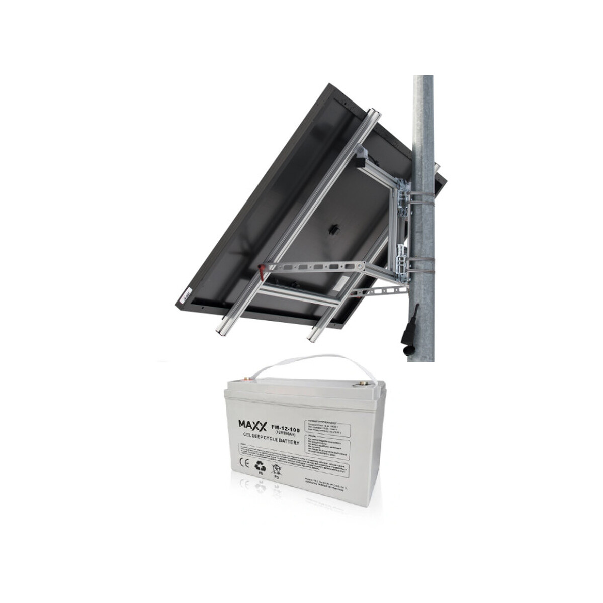 Kompletna elektrownia solarna do kamer CCTV – wersja mobilna do szybkiego montażu. Mobilny, kompletny zestaw do zamocowania do boku słupa lub do ściany. Duży akumulator przeznaczony do zakopania pod ziemią.