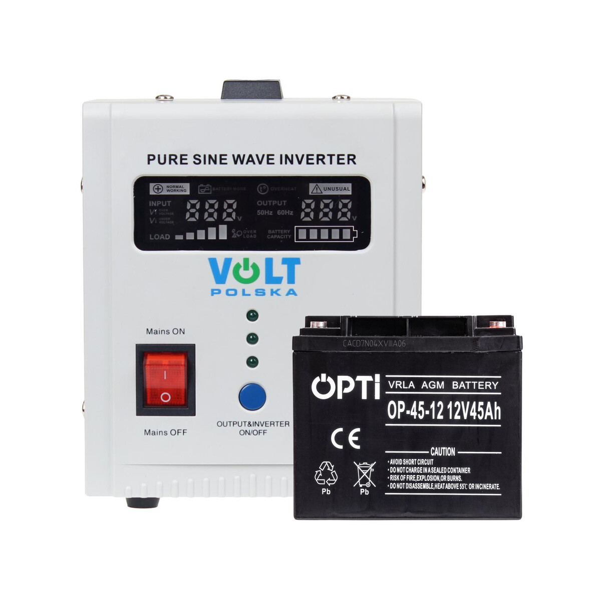 Zestaw do awaryjnego zasilania 45Ah 500W, składający się z akumulatora VOLT POLSKA 12V 45Ah z serii OPTI oraz przetwornicy 12V 300/500W to kompletny zestaw zasilania awaryjnego!