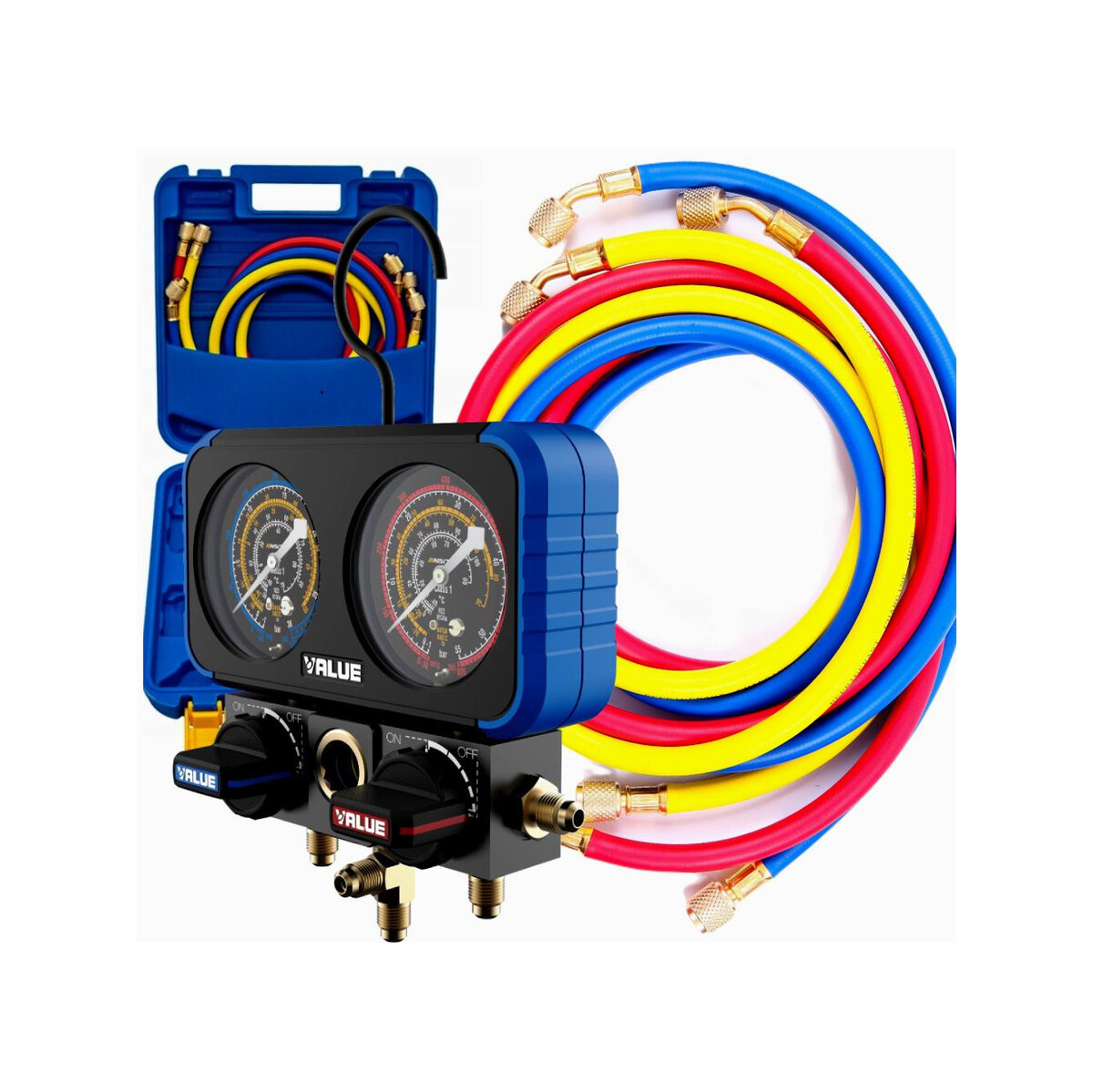 - W zestawie znajduje się również praktyczna walizka, która ułatwia przechowywanie i transport manometrów oraz dodatkowych akcesoriów. Zawiera on również trzy węże o długości 150 cm każdy (dwa w kolorach niebieskim i czerwonym i o średnicy 1/4 „-5/16” oraz jeden w kolorze żółtym, o średnicy 1/4 „-1/4”), co zapewnia elastyczność i łatwość obsługi. Dodatkowo, w zestawie znajdują się dwa adaptery 5/16 „-1/4”, co zwiększa kompatybilność zestawu z różnymi rodzajami zaworów.